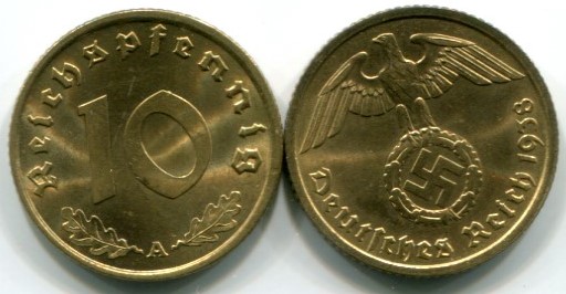 10 Reichspfennig, which depict an eagle holding a swastika. The coins